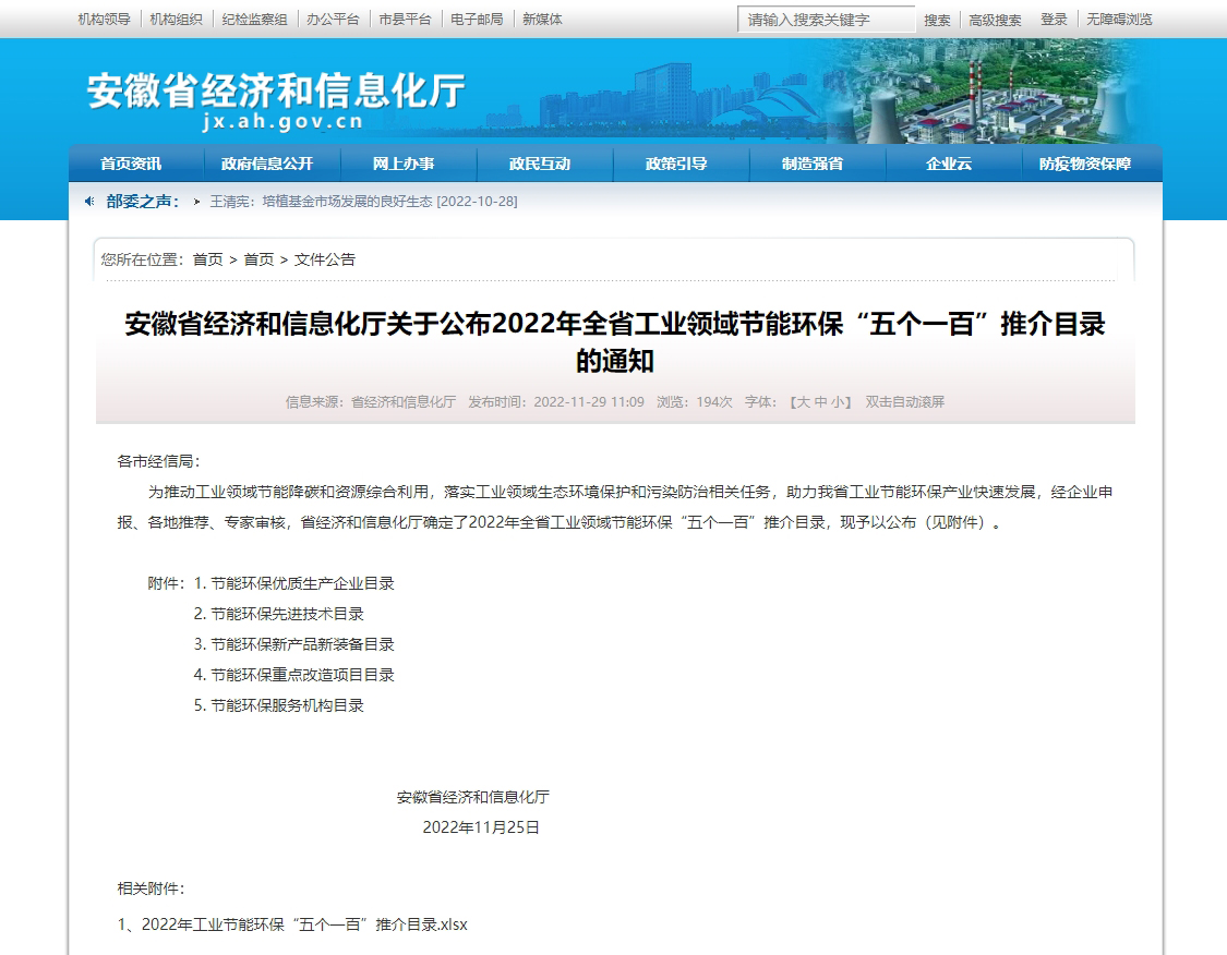 11月29日,安徽省经济和信息化厅公布了2022年全省工业领域节能环保“五个一百”推介目录,乐鱼科技“抗水耐硫脱硝催化剂制备技术”入选“节能环保先进技术”目录,“防静电聚四氟乙烯覆膜滤料”入选“节能环保新产品新装备”目录。