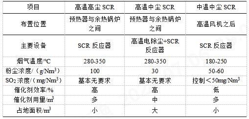 根据进入SCR反应器烟气温度和粉尘浓度的不同,水泥窑尾烟气SCR脱硝系统工艺路线通常可分为高温高尘、高温中尘、中温中尘三种(各工艺对比内容见下表)。