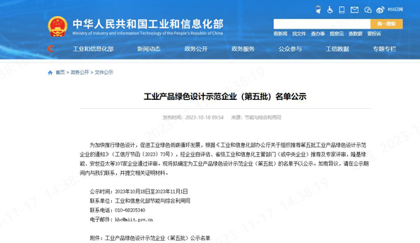中华人民共和国工业和信息化部官方网站于10月18日发布了《工业产品绿色设计示范企业(第五批)名单公示》,经过初审筛选、复审答辩,乐鱼科技成功获得工业产品绿色设计示范企业荣誉称号。